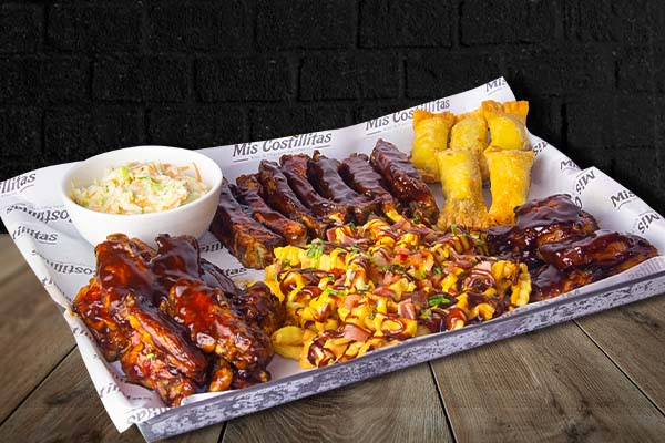 Toda la experiencia de Mis Costillitas en un solo plato: Costillitas, Papi Julio, Costipapas, 10 alitas, 05 Tequeños de Papi Julio y coleslaw.